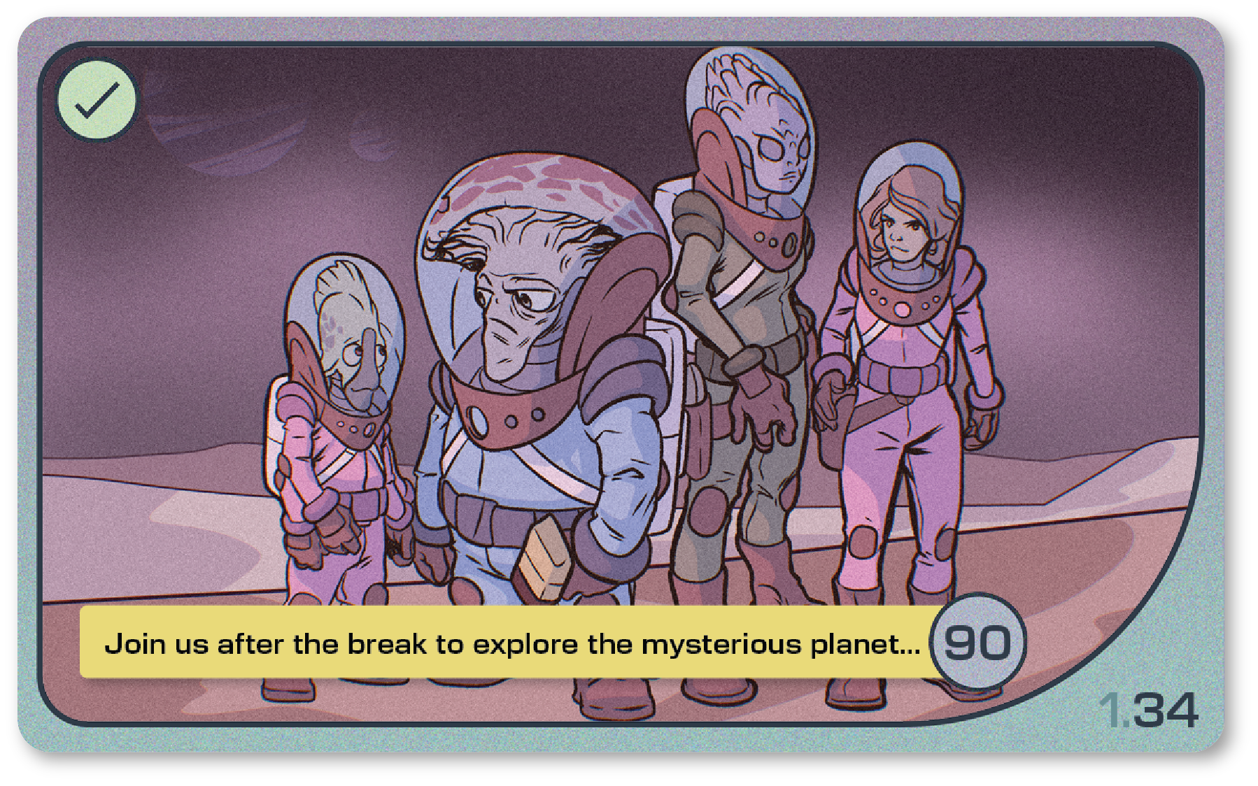 The idea of Interstellar Adventures is to create an immersive TV show-like puzzle adventure, complete with compelling characters, snappy dialogue and dynamic illustrations. It was clear from the start of the project that we wanted to use comic book-style art to quickly communicate the narrative of the puzzle adventure.